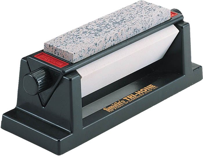 Smiths 3-Stone Sharpening System features a 6 Medium Synthetic Stone, 6 Fine Arkansas Stone, and 6 Coarse Synthetic Stone mounted on a molded plastic triangle with handles on the end for easy stone rotation and easy to read stone identification. The sturdy molded plastic base has nonskid rubber feet for safety, V trough to catch the oil drippings, and is easy to clean. A bottle of Premium Honing Solution and a sharpening angle guide are also included.• 3-SIDED – Includes 1,000-grit Arkansas stone, 800-grit synthetic stone, & 300-grit synthetic stone.
