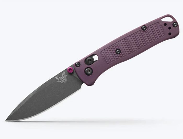 When searching for colors to freshen up our lineup of Mini BugoutĀ® knives, we discovered a tone that embodied a kind of vibe in the outdoors that only lasts for a matter of moments. On the new 533GY-09 Mini BugoutĀ®, the dark purple Grivory handle scales paired with a purple PVD mini deep carry clip and purple anodized thumb stud and barrel spacers were inspired by that cool, half-light at dusk that you see around the campsite before the dark of night moves in. Complete with a CPM-S30V stainless steel blade with a Cerakote Tungsten finish, the 533GY-09 carries light and tackles any task, outdoors or in.