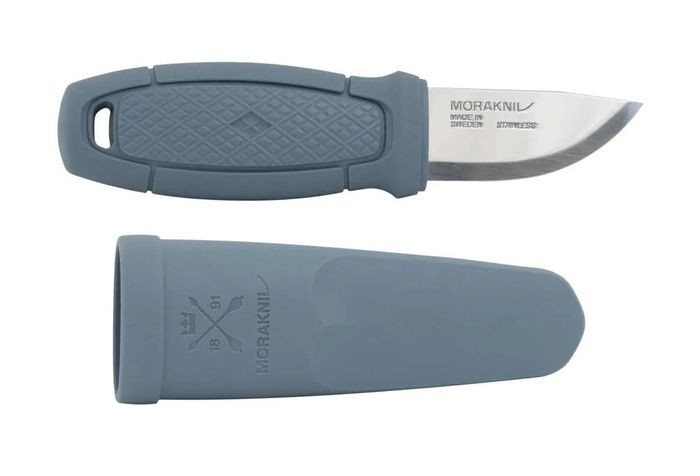 The ergonomic barrel-shaped polymer handle has a finger protection to minimize cuts. Thanks to the handle and knife blade construction, you can work safely with the knife in all the different weather conditions of the year. The polymer knife sheath is symmetrical, which means that it fits both right- and left-handed users. Made in Mora, Sweden.
