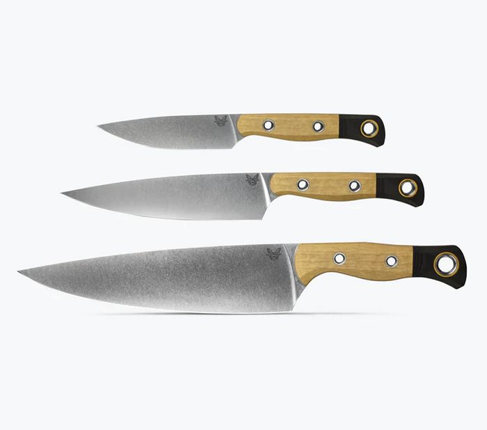 The 3 Piece Set promises a precise cut, a unique aesthetic and a sharp edge thanks to Benchmade’s proprietary SelectEdge® technology. Complete with an 8” Chef Knife for thin slices of vegetables, a 6” Utility Knife with a shorter blade and small tip for trimming, and a 4” Paring Knife used for cutting and peeling fruits and veggies, and trimming excess fat with ease. Over time, Richlite®, a paper composite material, will develop a natural patina over time, altering the original color of the material. 'Patina' is a natural occurrence in the product that can either darken or lighten depending on exposure to light.